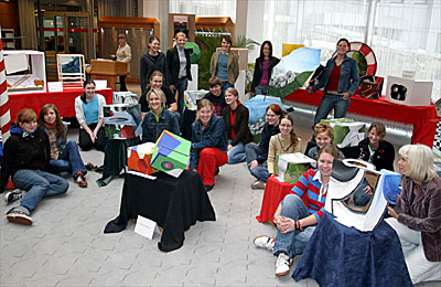 MOERS. Verdrehte und auf den Kopf gestellte Welten können Kunden der Sparkasse am Niederrhein derzeit in der Hauptstelle am Ostring entdecken. Der Leistungskurs Kunst der Jahrgangsstufe 12 am Grafschafter Gymnasium stellt dort noch bis Dienstag, 20. Juli, seine „Raumwelten“ aus. Kunstlehrerin Gerlind Wilkes: „Im Rahmen einer Hausaufgabe haben sich die Schülerinnen und Schüler mit den Möglichkeiten und Problemen räumlicher Gestaltung beschäftigt.“ Ein Blick auf die rund zwanzig Exponate zeigt, wie unterschiedlich die Ergebnisse einer solchen Aufgabenstellung ausfallen können.
