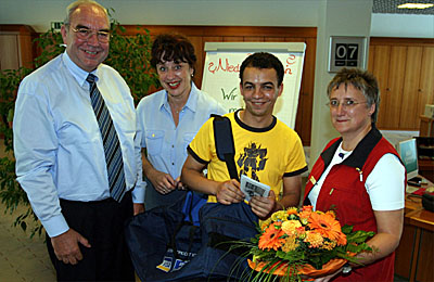 Beim Einkauf mit der Visa-Karte im Aktionszeitraum von Anfang April bis Ende Mai erwarb jeder Karteninhaber zugleich ein Teilnahmelos des Visa-Gewinnspieles. Als Hauptpreise winkten fünf Reisen für je zwei Personen zu den Olympischen Spielen. Für den deutschen Staatsbürger marokkanischer Herkunft Abdel Kader Hammou kam die Sporttasche gerade zur rechten Zeit. Unmittelbar nach der Preisübergabe fuhr der Schichtarbeiter für zwei Wochen nach Marokko. Doch auch danach, so erzählte er bei einer Tasse Kaffee, habe er durchaus Verwendung dafür. Abdel Kader Hammou: „Ich spiele aktiv Fußball und hier paßt wirklich viel rein.“ – Herzlichen Glückwunsch!