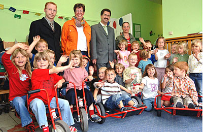 BORTH. Spiel-Fahrzeuge für die Dötze des Kindergartens Borth, der in diesen Tagen sein 50jähriges Bestehen feierte, überbrachten jetzt Frank Waschipki (li.) und Frank Tatzel von der Sparkasse am Niederrhein. Die Leiterin der Einrichtung, Hannelore Kelz (zwischen den beiden Gästen) und Erzieherin Klaudia Gallwitz freuten sich gemeinsam mit den Kindern über die schönen Geschenke, die gleich ausprobiert wurden. Die Finanzierung erfolgte aus Mitteln des PS-Zweckertrages