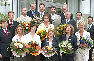 NIEDERRHEIN. Herzliche Glückwünsche und schöne Blumensträße galten in diesen Tagen neun Mitarbeiterinnen und Mitarbeitern der Sparkasse am Niederrhein, die in dem Kreditinstitut bzw. dessen Vorgängerinstituten seit 25 Jahren tätig sind. Die vordere Reihe bilden (von links) Winfried Schoengraf (Vorstand), Gabriele Wasylkowski, Sigrid Kalwa, Marion Strehlow, Beate Solty und Petra Graef. Dahinter von links Bernhard Uppenkamp (Vorstand), Volker Krön, Alfred Heuchert, Norbert Kubik, Heike Hülsken, Franz-Josef Stiel (Vorstand), Heinz-Jürgen Rheims, Wolfgang Hoffmann sowie die Vorstandsmitglieder Frank-Rainer Laake und Giovanni Malaponti. - Viele Kolleginnen und Kollegen des Hauses Sparkasse am Niederrhein schließen sich den herzlichen Glückwünschen an und wünschen den Jubilaren alles Gute für die Zukunft!