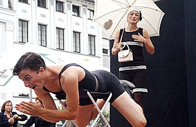 Clown und Jongleur Thomas Plattner vom Berliner Zirkus Amalgam ließ bei Kleier die Plastikkeulen wirbeln. Geschickt wußte er das Publikum in seine Kunststücke einzubinden. Als er schließlich Aluminiumröhren und –stäben beim Jonglieren bezaubernde Klänge entlockte, hatte er die Zuschauer auf seine Seite gebracht. Nach Jonglage von Clown Thomas Plattner und Puppenshow von „Trukitrek“ entführten, wiederum am Altmarkt, die beiden spanischen Künstler von „Keaton und Keaton“ ihre Zuschauer in eine romantische Liebeswelt.
