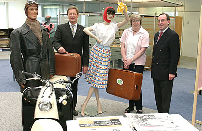 Auch ein alter Zündapp-Motorroller ist zu bewundern. Im Hintergrund von links: Sparkassendirektor Bernhard Uppenkamp, Museumsleiterin Jutta Lubkowski und Geschäftsstellenleiter Jürgen Theuvsen.
