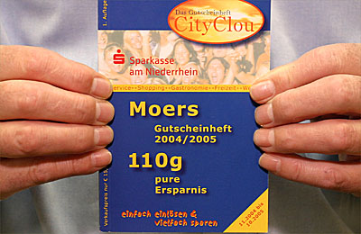 MOERS. Noch bis zum Oktober 2005 behält der „CityClou“ Gültigkeit, der seit einiger Zeit in der Grafenstadt angeboten wird. Das Gutscheinheft bietet auf 90 Seiten die Möglichkeit, bei ausgesuchten Unternehmen (Gastronomie, Handel, Dienstleister) in Moers Ermäßigungen und Rabatte in Anspruch zu nehmen. Der reguläre Einzelverkaufspreis beträgt 15,90 Euro, bei Sammelbestellungen fällt der Preis günstiger aus.