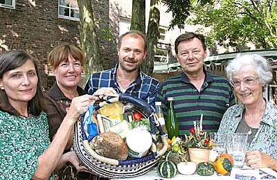 Bewußt gesund leben. Von links: Marion May-Hacker und Ingrid Otte (Lokale Agenda 21), Obstbauer Arne Weißenfels, Sparkassendirektor Winfried Schoengraf sowie Waltraud Weinhold (Ökumenisches Forum).
