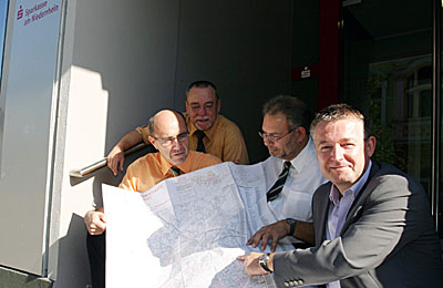 Die Immobilien-Berater der Sparkasse am Niederrhein, Michael Finkeldey, Volker Krön und Johannes Korfkamp (v.r.n.l.) sind seit Montag, 12. September, an der Homberger Straße 31 zu finden. Abteilungsdirektor Walter van Berk (ganz links): „Wir verstehen diesen Umzug als Konzentration unserer Kräfte an einem Ort, um die Kunden hier umfassend über die verschiedenen Möglichkeiten von Geldanlage und Altersvorsorge zu informieren“