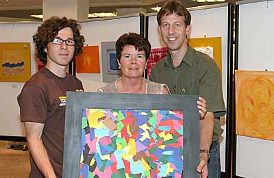Geschäftsstellenleiterin Maria Deselaers zeigt hier gemeinsam mit Carsten Böhm (li.) und Detlef Laufenburg von der "Lebenshilfe" eines der Bilder, die noch bis zum 30. September an der Burgstraße zu sehen sind.
