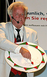 Professor Dr. Gernot Born stellt in Neukirchen verschiedene Modelle eines Perpetuum Mobile vor, die alle eines gemeinsam haben: Sie funktionieren nicht.