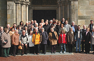 Erinnerungsfoto vor der Pfarrkirche von Legden. In der rechten Bildhälfte (heller Anzug): Bernhard Uppenkamp, Vorsitzender des Fördervereins der Neukirchen-Vluyner Wehr.