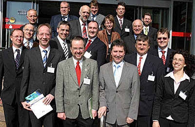Landrat Dr. Ansgar Müller (vorne, links) ist der Schirmherr des UnternehmensNetzwerkes. In den Räumen der Sparkasse am Niederrhein stellten alle Beteiligten das Ziel der Kooperation von Sparkassen, Volksbanken, Kammern und Universität vor.