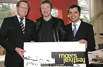 NIEDERRHEIN. Mit dem jetzt vorliegenden Programm des 35. Moers-Festivals (2. bis 5. Juni 2006) beginne eine neue Zeitrechnung. Das betonte der künstlerische Leiter, Reiner Michalke, in einer Pressekonferenz im Restaurant „Leonardo“. Das Festival nehme neue musikalische Strömungen in sein Angebot auf und lasse gleichzeitig die eigene Geschichte wieder sichtbar werden. Das Restaurant im Moerser Schloßpark habe man deshalb als Ort der Pressekonferenz gewählt, „weil hier in der Nachbarschaft 1972 alles begonnen hat.“ Michalke wies dabei aus dem Fenster auf den Schlosshof, wo seinerzeit das „Internationale New-Jazz-Festival Moers“ aus der Taufe gehoben wurde.