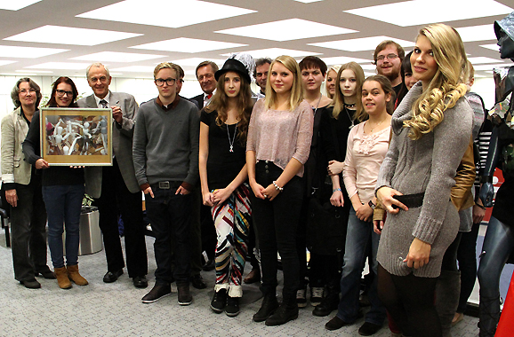 Sparkassenvorstand Bernhard Uppenkamp (6. v.l.) mit den Stipendiaten und den Leitern der Kunstschule anlässlich der Vernissage auf der Empore der Sparkasse an der Poststraße.