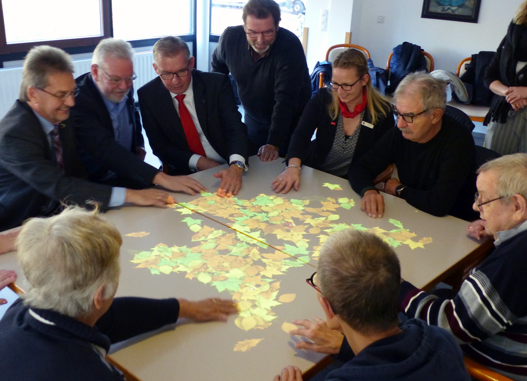 ALPEN. Das Laub auf dem Tisch ist widerspenstig. Kaum liegt es auf einem Haufen, hat es sich schon wieder auf der ganzen Fläche verteilt. Mit viel Freude und Bewegung schieben es die Bewohner des Marienstiftes von neuem zusammen und die Besucher helfen dabei. „Unsere Tovertafel kommt unheimlich gut an und macht allen viel Spaß“, sagt die Gerontologin Barbara Winter. Der kleine viereckige Kasten an der Decke projiziert mit Hilfe eines Beamers und mehrerer Sensoren ganz verschiede Spiele auf den Tisch oder den Boden darunter. Gemeinsam mit der Gemeinde und weiteren Spendern half die Sparkasse am Niederrhein dabei, dass im Marienstift nun insgesamt zwei Tovertafeln hängen können.