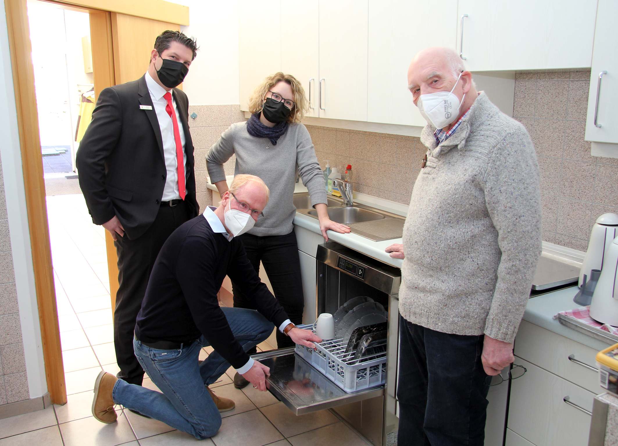 Rolf Ernst (v.r.n.l.), Lena Tersteegen und Martin Teuber, die sich ehrenamtlich im Evangelischen Vereinshaus Repelen engagieren, zeigen Geschäftsstellenleiter Oliver Heger die neue Gastronomie-Spülmaschine, die sich der Verein dank eines 1.000-Euro-Zuschusses der Sparkasse am Niederrhein kaufen konnte.