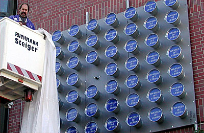 MOERS. Wenn man die A 57 in südlicher Richtung befährt und gerade das Autobahnkreuz Kamp-Lintfort passiert hat, dann sieht man es schon. Seit der Nacht der Zeitumstellung vom 26. auf den 27. Oktober 2002 erstrahlt der Feuerwehrturm am Jostenhof in Hülsdonk in einem leuchtenden Blau. 28 Strahler tauchen den nüchternen Zweckbau in ein geradezu unwirkliches Licht mit einer klaren Botschaft: „Wasser ist Leben“. Als Pit Bohne am Samstagabend das erste Mal den Schalter für sein Kunstwerk umlegte, waren rund 300 Zuschauer mit dabei. Zuvor schon hatte er gemeinsam mit Bürgermeister Rafael Hofmann ein weiteres Kunstwerk der Öffentlichkeit übergeben. Als gedankliches Pendant zu dem beleuchteten Turm enthüllten die beiden eine Installation aus 56 von innen beleuchteten Zinkeimern an der Fassade des ENNI-Kundenzentrums an der Uerdinger Straße.