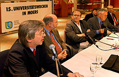 Professor Ingo Wolff, der Rektor der Universität Duisburg, nutzte die Gelegenheit, sich vom Moerser Auditorium zu verabschieden. „Meine Zeit als Rektor ist um, nur die Entscheidung der Landesregierung bezüglich der Fusion der beiden Universitäten Duisburg und Essen entscheidet, ob zum 1. Januar 2003 oder erst zum 23. März.“ Sparkassendirektor Hartmut Schulz kündigte zuletzt an, „die Erfolgstory der Universitätswochen im nächsten Jahr weiter zu schreiben.“ Dr. Klaus-G. Fischer, der bislang alle Veranstaltungen kompetent vorbereitet habe, arbeite bereits an dem Thema der 16. Universitätswochen in Moers, verriet Direktor Schulz.