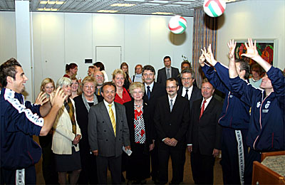 Beim Festakt im Casino der Sparkasse zeigte sich die stellvertretende Landrätin Margit Oesterling sichtlich vom Ballgefühl einiger Spieler des MSC beeindruckt. Vor dem Aufschlag zum Bundesligaspiel gegen TuB Bocholt hatten Günter Krivec und einige Volleyballer der ersten Mannschaft sich die Zeit genommen, die rund 50 Ehrengäste des Festaktes sportlich zu begrüßen. Egon Baumgarten, Präsident des Westdeutschen Volleyball Verbandes, und Ulla Grunert, die stellvertretende Vorsitzende des Kreissportbundes Wesel, nutzten im Anschluß die Gelegenheit, beim Bundesligaspiel dabei zu sein.