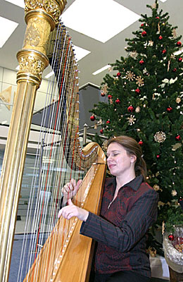 NIEDERRHEIN. Harfenklänge erwarten Besucher in etlichen Geschäftsstellen der Sparkasse am Niederrhein in diesen vorweihnachtlichen Tagen. Die russische Harfenistin Elena Janzen spielt Weihnachtslieder sowie klassische und moderne Kompositionen. Am Freitag, 16. Dezember 2005, war die junge Musikerin, die ihre Ausbildung am Konservatorium in St. Petersburg erhielt, in den Geschäftsstellen Sonsbeck und Alpen zu Gast. Sie spielte jeweils eine knappe Stunde. Am Dienstag, 20. Dezember, kam die Harfenistin um 11 Uhr in die Geschäftsstelle Bahnhofstraße in Rheinberg, und um 14 Uhr spielte sie in Orsoy am Müschensteg. In Moers wird die Musikerin am Donnerstag, 22. Dezember, zu hören sein, und zwar um 12 Uhr in der Geschäftsstelle Vinn und ab 14 Uhr in der Hauptstelle am Ostring. Der Eintritt ist natürlich frei.