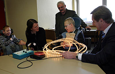 Leon und Pascal zeigten zusammen mit ihrer Lehrerin Barbara Fiebig, wie sie über einen sogenannten „Talker“ elektrische Geräte an- und ausschalten können. Der Talker öffnet und schließt über verschiedene Schalter und Sensoren Stromkreise. So können die Kinder, je nach Art und Grad ihrer Behinderung, an Spielen sowie am Hauswirtschafts- oder Werkunterricht teilnehmen. Schulleiter Petrikowski: „Dies ist oft die einzige Chance für unsere Schüler, aktiv am Unterricht und damit an der Gemeinschaft teilzunehmen.“ Dieses Erfolgserlebnis sei sehr wichtig für die Entwicklung der verbliebenen Anlagen und Fähigkeiten.