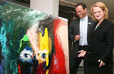 Leuchtende, ausdrucksstarke Farben kennzeichnen die Bilder von Marion Schiffer, hier mit Sparkassenvorstand Frank-Rainer Laake bei der Ausstellungseröffnung in der Sparkasse an der Bahnhofstraße.