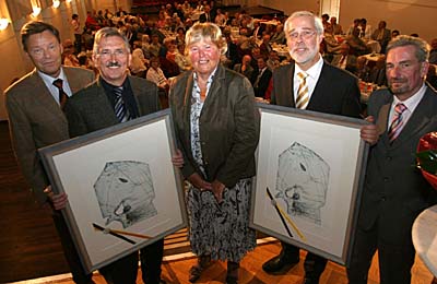 Kornelia Kuhn, Vorsitzende des Kuratoriums der Sparkassen-Kulturstiftung Neukirchen-Vluyn, vergab die Bürgerpreise an den Heimat- und Verkehrsverein Neukirchen e.V. und den Heimat- und Verkehrsverein Vluyn e.V. Die Vereinsvorsitzenden Hans-Peter Burs (2.v.l.) und Hans Delihsen (4.v.l.) nahmen die Grafiken vor rund 130 Gästen entgegen. Den Vorsitz der Kulturstiftung teilen sich Winfried Schoengraf (links) und Hans-Joachim Rupprecht (rechts).