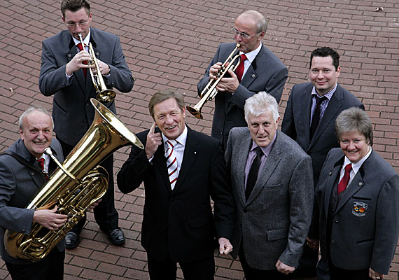 Vorstand Bernhard Uppenkamp (3.v.l.) wird ganz harmonisch eingerahmt: Heinz-Gerd Haal spielt die Tuba, Ludger Joosten und Karl-Heinz Biermann die Trompete (v.l.). Bürgermeister Leo Giesbers (3.v.r.) und Sparkassen-Geschäftsstellenleiter Daniel Janßen (r.) freuen sich über die Förderung der beiden Musikvereine Harmonie 1911/1921 Sonsbeck/Labbeck, zu denen auch Hildegard Pieper gehört.