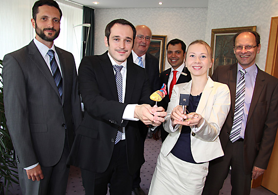 Dr. Ekaterina Nannen (2.v.r.) und Thomas Schmidt (2.v.l.) erhalten in diesem Jahr die Innovationspreise Ingenieurwissenschaften der Sparkasse. Gemeinsam mit ihren Betreuern Professor Gerd Bacher (rechts) und Dr.-habil. Daniel Balzani (links) stellten sie Ihre prämierten Abschlussarbeiten vor. Dr. Klaus-G. Fischer (hinten links) und Giovanni Malaponti (hinten rechts) vom Förderverein Ingenieurwissenschaften gratulierten den Preisträgern.