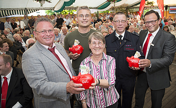 XANTEN. Für die Caritas-Konferenz St. Viktor, die Freiwillige Feuerwehr und den Landestambourcorps St. Victor Birten lohnte sich der Ausflug nach Marienbaum gleich doppelt. Beim Ehrenamtsforum der Sparkasse am Niederrhein im Festzelt der Schützen erhielten sie je 250 Euro extra. Insgesamt vergab die Sparkasse unter den mehr als 300 Vertretern der örtlichen Vereine, Verbände und Institutionen rund 100.000 Euro. „Unsere Spenden sollen Ihnen jetzt und in Zukunft eine verlässliche Unterstützung Ihrer ehrenamtlichen Arbeit sein“, so Vorstand Frank-Rainer Laake.