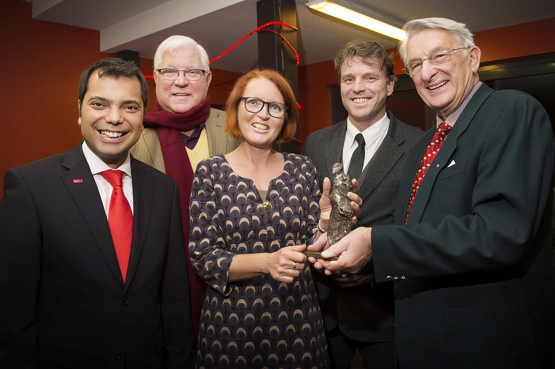 MOERS. Damit hatte Christiane Rasche-Hüsch nicht gerechnet: Bürgermeister Christoph Fleischhauer, Sparkassen-Chef Giovanni Malaponti und der Vorstand des Freundeskreises Hanns Dieter Hüsch überraschten sie jetzt mit einer guten Nachricht: „Die Finanzierung der Hüsch-Skulptur steht, wir können sie anlässlich seines 90. Geburtstages am 6. Mai 2015 vor dem Bildungszentrum enthüllen", so Willi Brunswick und Dr. Hans-Albrecht Meyer-Stoll vom Freundeskreis.