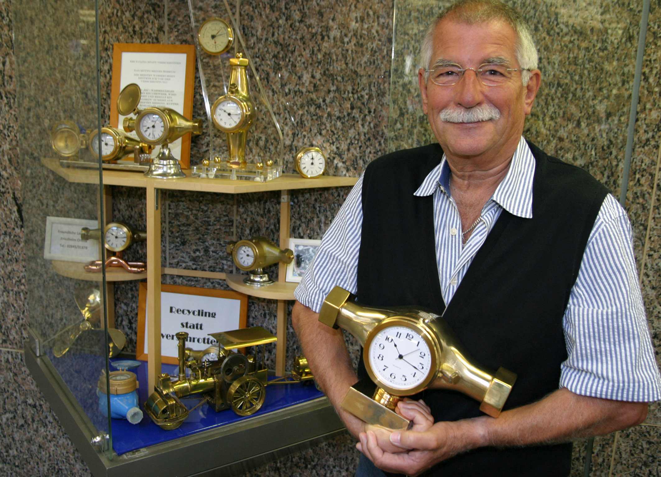 NEUKIRCHEN-VLUYN. Ein zufälliger Fund bei einem Schrotthändler brachte Friedhelm Orlitta auf die Idee: „Es ist zu schade, Dinge wegzuschmeißen, aus denen man noch etwas Schönes und Brauchbares machen kann", sagt der ehemalige Schwimm-Meister des Freizeitbades. Vor zehn Jahren baute er die erste Quarzuhr in einen ausrangierten Wasserzähler ein. Jetzt zeigt er seine schönsten Stücke in einer Vitrine der Sparkassen-Geschäftsstelle an der Poststraße.