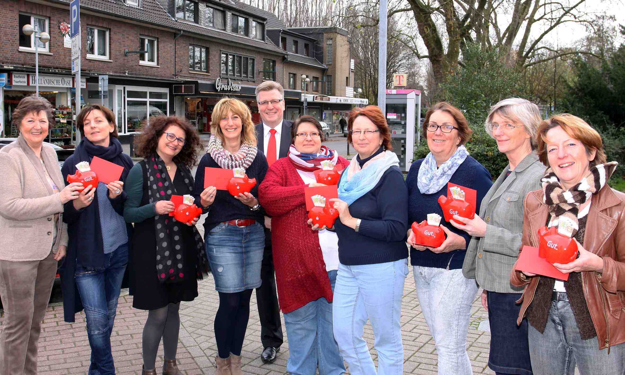 Margot Klein (l.) und Detlev Moll von der Werbegemeinschaft Meerbeck überreichten Spenden von insgesamt 1650 Euro an Annette Becker (Dreikönigskindergarten), Christine Joliet (SCI-Kinderhaus), Ute Thöming (St. Barbara Kindergarten), Cornelia Otto (Johannes-Kindergarten), Petra Weier (KG Lusticana), Anke Vogelsang (Familienzentrum Barbarastraße), Renate Dettke (Uhrschule) und Ute Kampow (Eichendorffschule). „Das Geld soll den Kindern in unserem Viertel zugute kommen“, so die Vorsitzende der Werbegemeinschaft Margot Klein.
