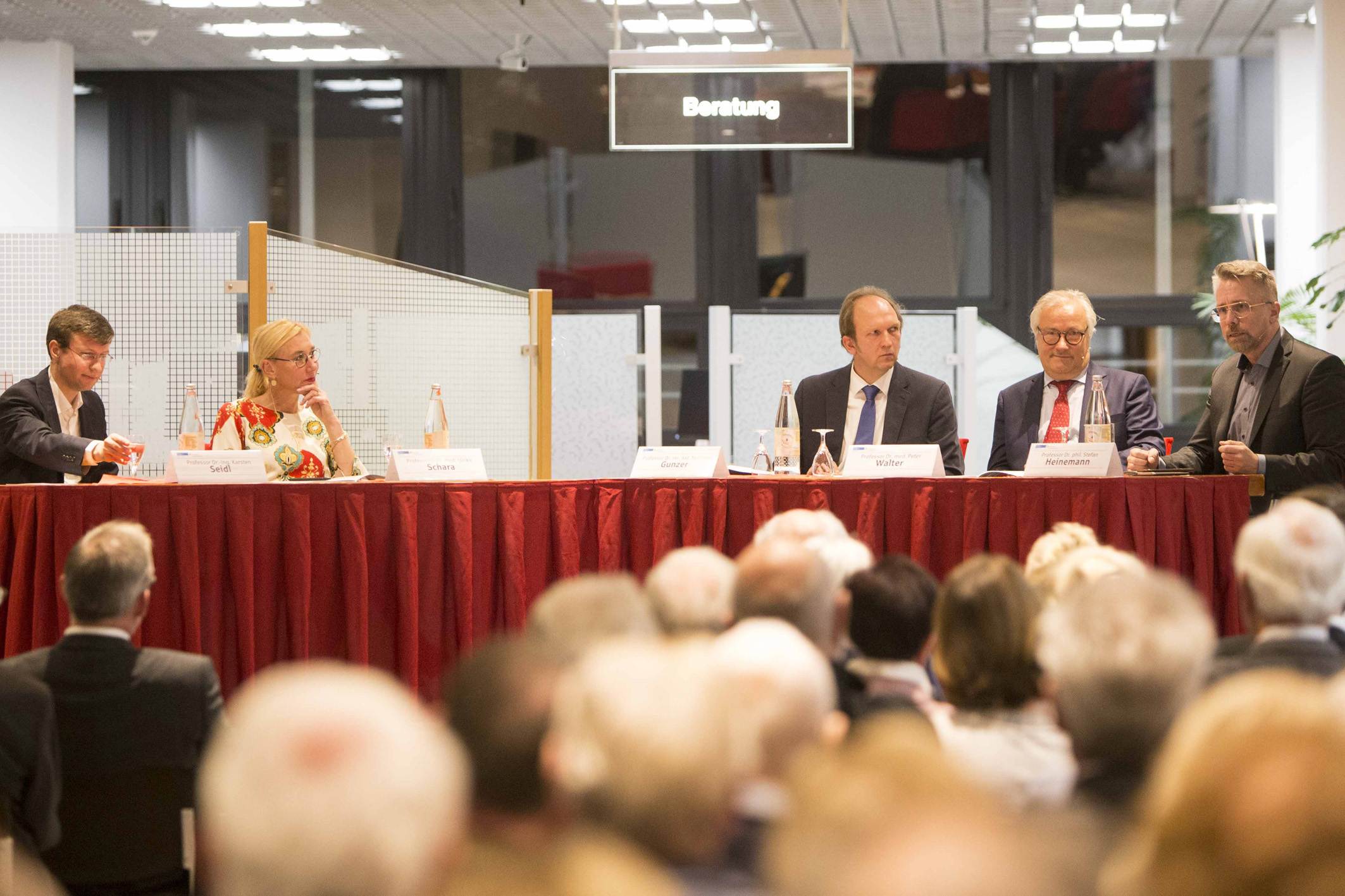Diskutierten in der Kundenhalle der Sparkasse am Ostring die Chancen und Grenzen medizinischer Implantate (v.r.n.l.): Professor Stefan Heinemann, Professor Peter Walter, Professor Matthias Gunzer, Professorin Ulrike Schara und Professor Karsten Seidl.