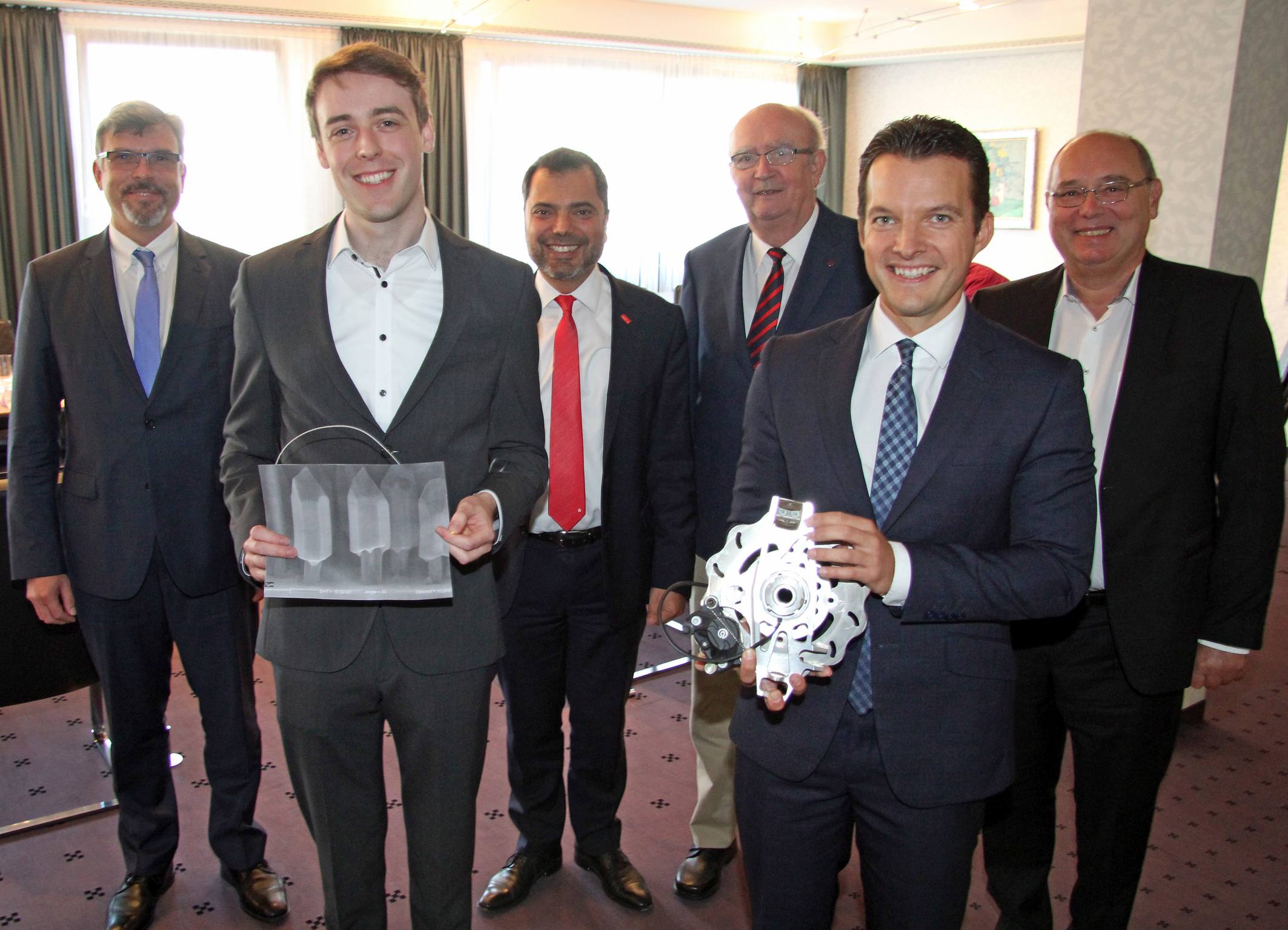 Die Preisträger der Innovationspreise Ingenieurwissenschaften berichteten von ihrer Forschung und ihren Abschlussarbeiten (v.l.n.r.): Professor Dr. Nils Weimann, Patrick Häuser, Giovanni Malaponti, Dr. Klaus-G. Fischer (Förderverein Ingenieurwissenschaften), Dr. Frédéric Etienne Kracht und Professor Dr.-Ing. Dieter Schramm.