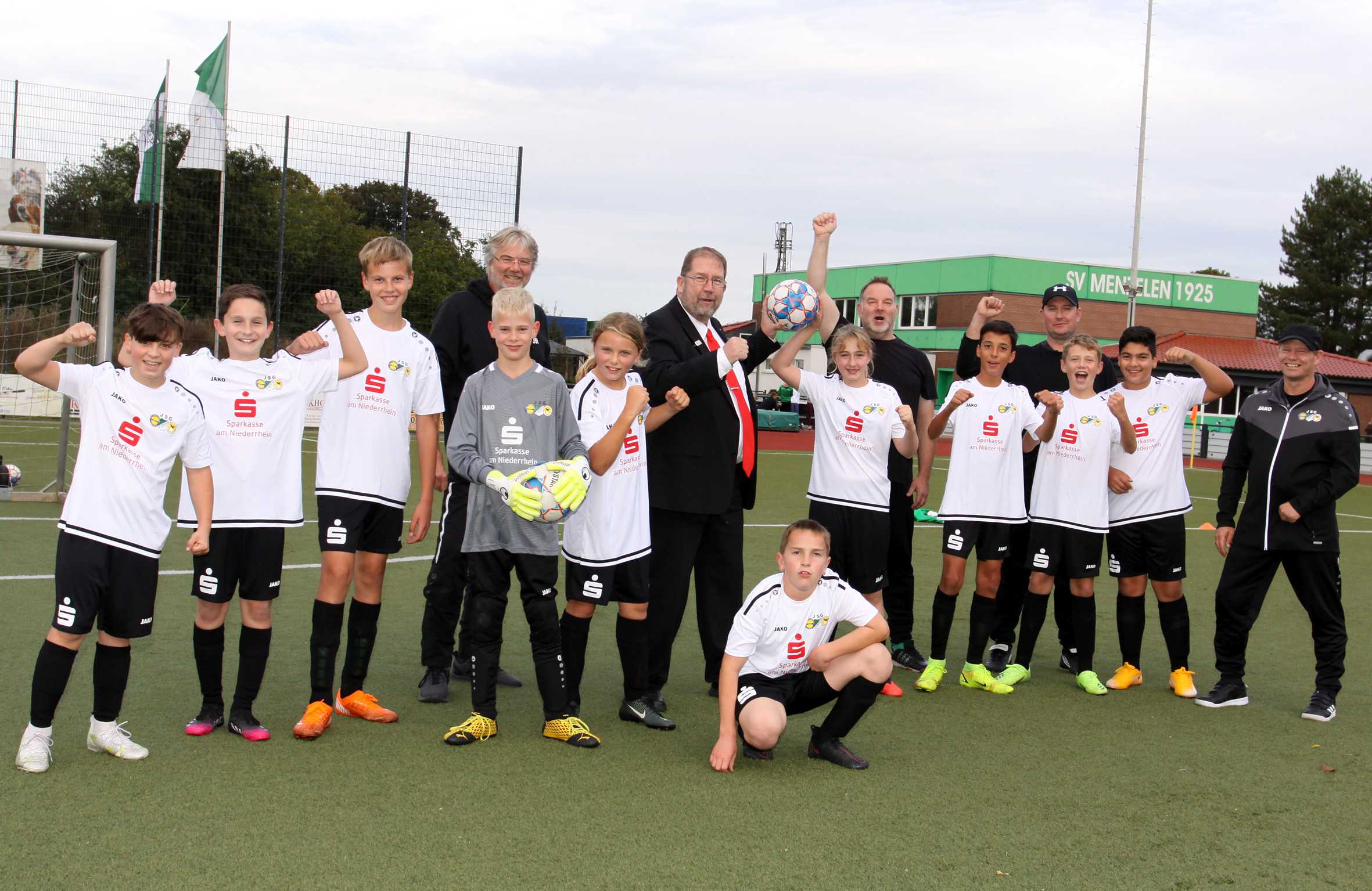 ALPEN. Die D-Junioren der Jugendspielgemeinschaft Veen-Menzelen-Alpen spielen erfolgreich Fußball. Erst kürzlich gewannen Leni Keller und ihre 12 Jungs das Kreispokal-Viertelfinale gegen den FC Neukirchen-Vluyn auf der Platzanlage des SV Menzelen. Den Sieg errangen sie in neuen Trikots, die ihnen Volker Oppers von der Sparkasse am Niederrhein kurz vor dem Anpfiff überreicht hatte. Die Neue Spielkleidung als Glücksbringer? – „Sowas haben unsere 10- bis 12-jährigen Kicker nicht nötig“, sagt Jugendgeschäftsführer Marcus Kolodzy und lacht. Zusammen mit Jörg Rösken, Jens Meier und Christian Keller trainiert er das talentierte Team zweimal pro Woche.