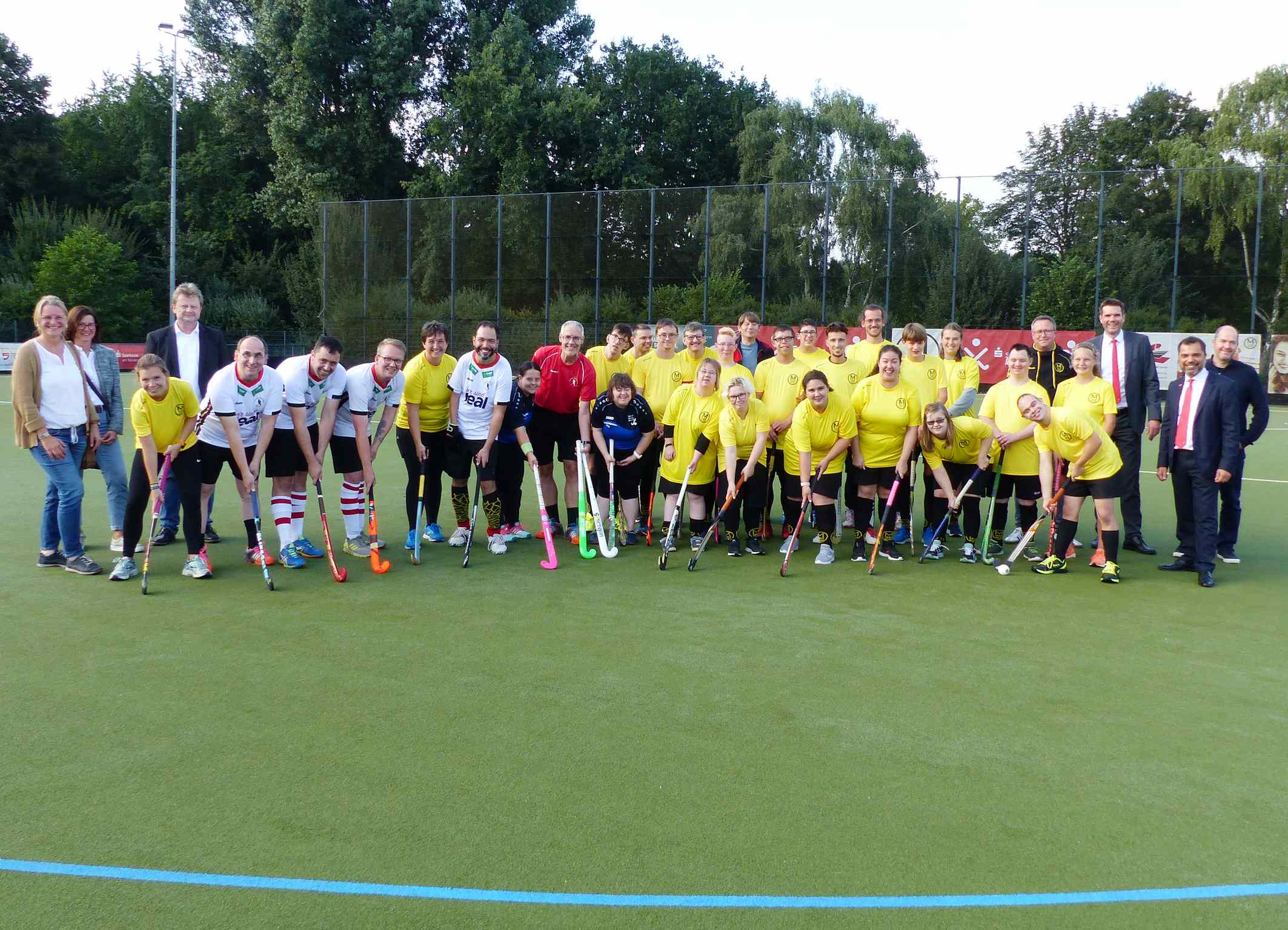 Vorstellung der neuen Specialhockey-Mannschaft beim MTV. Mit dabei Trainer Claus Heinze vom Deutschen Hockeybund (rotes Trikot), vier Nationalspieler (weiße Trikots), Sportdezernent Claus Arndt (ganz rechts) Giovanni Malaponti vom Sponsor Sparkasse am Niederrhein (links daneben), Andreas Bögner (6.v.r) und Fachbereichsleiter Olaf Finke.