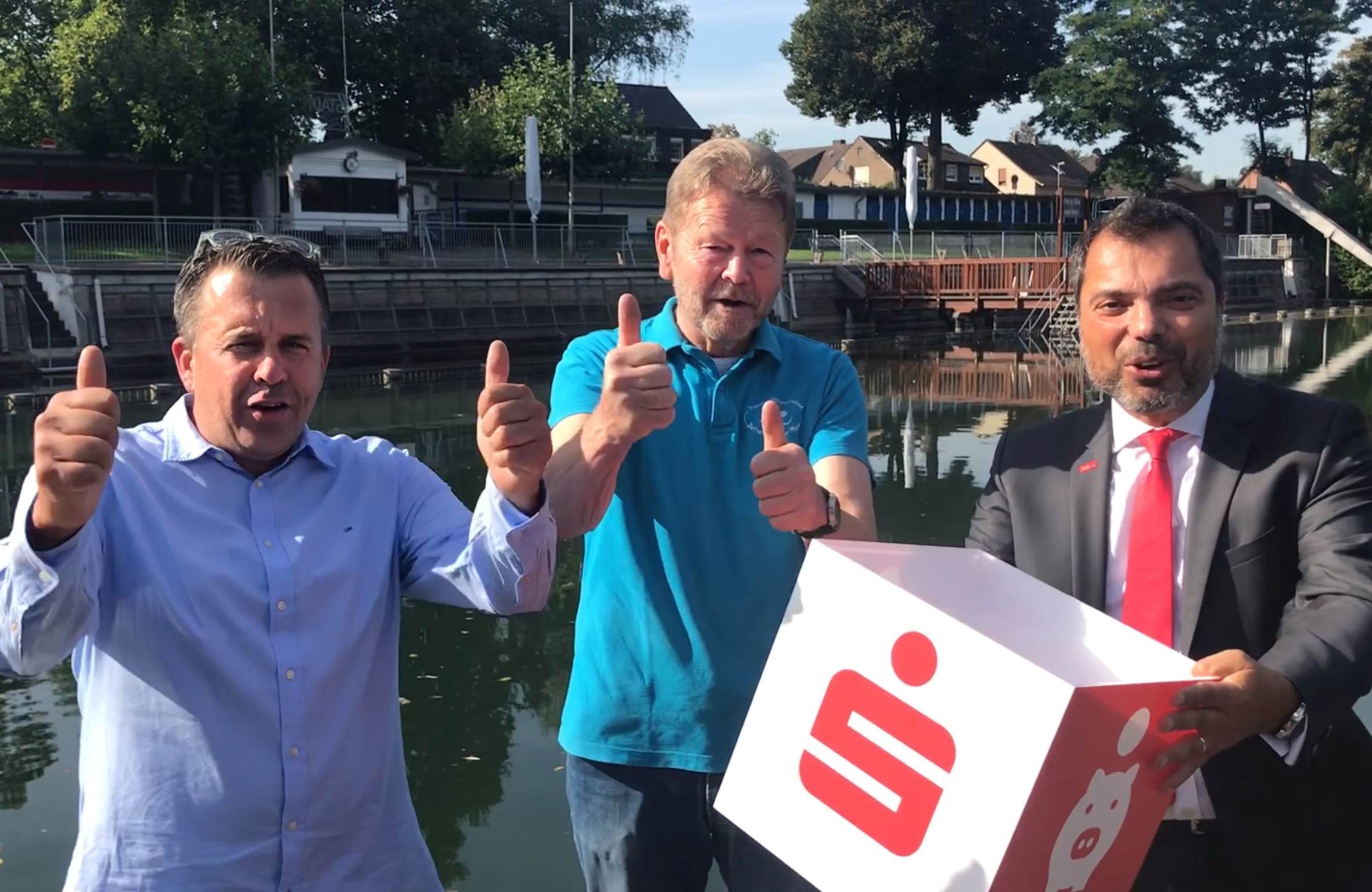 Die Verlosung der drei Extraspenden fand im Naturfreibad Bettenkamper Meer statt. Sparkassenchef Giovanni Malaponti (von rechts) hielt die Losbox, Freundeskreis-Gründungsmitglied Otto Laakmann zog die Lose und der aktuelle Vorsitzende Tobias Berndt verlas die Gewinner. Je 250 Euro erhalten der Spielverein Schwafheim 1932, der Förderverein Kindergarten Erlenweg und der Moerser Snooker-Club. Das Ziehungsvideo ist auf den Social-Media-Kanälen YouTube, Facebook und Instagram der Sparkasse zu finden.