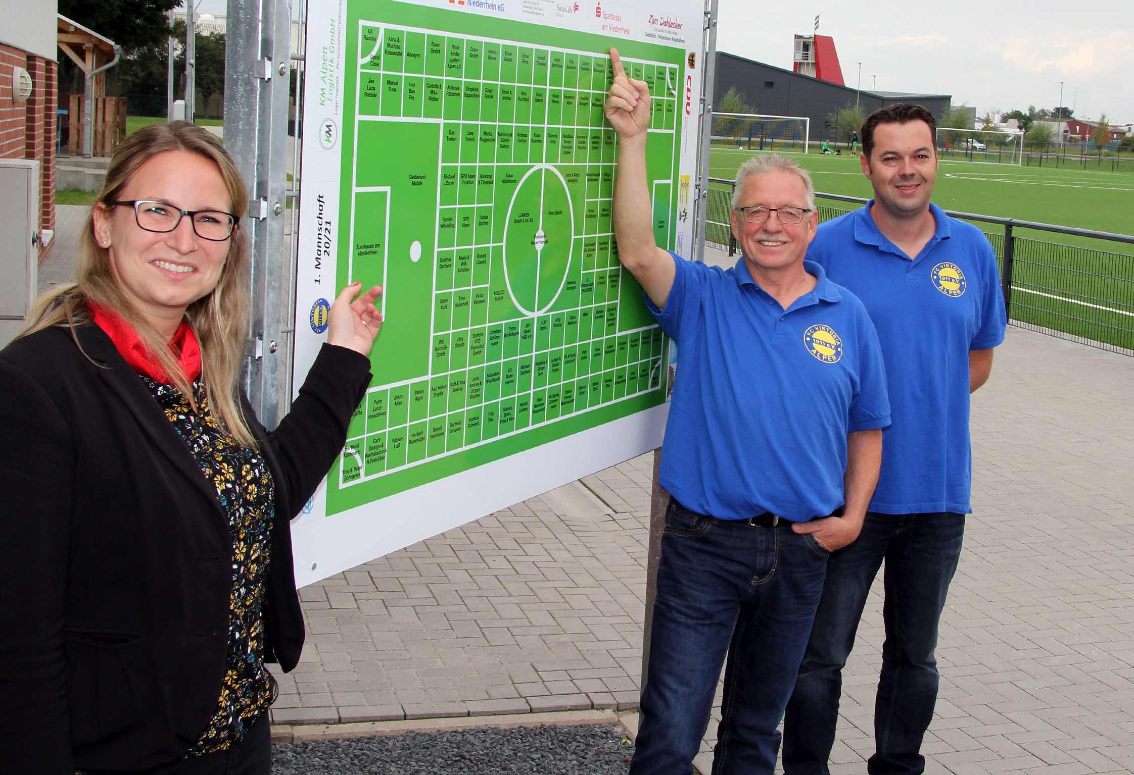 Kathrin Hüsch zeigt auf den Torraum des neuen Kunstrasenplatzes vom FC Viktoria Alpen, Geschäftsführer Jürgen Rischer (Mitte) deutet auf eine Bande. Beide Parzellen erwarb die Sparkasse am Niederrhein auf einer Internet-Plattform und unterstützte so den Verein mit 1.400 Euro. Pressewart Björn Niedrig betreute den virtuellen Spendenmarathon.