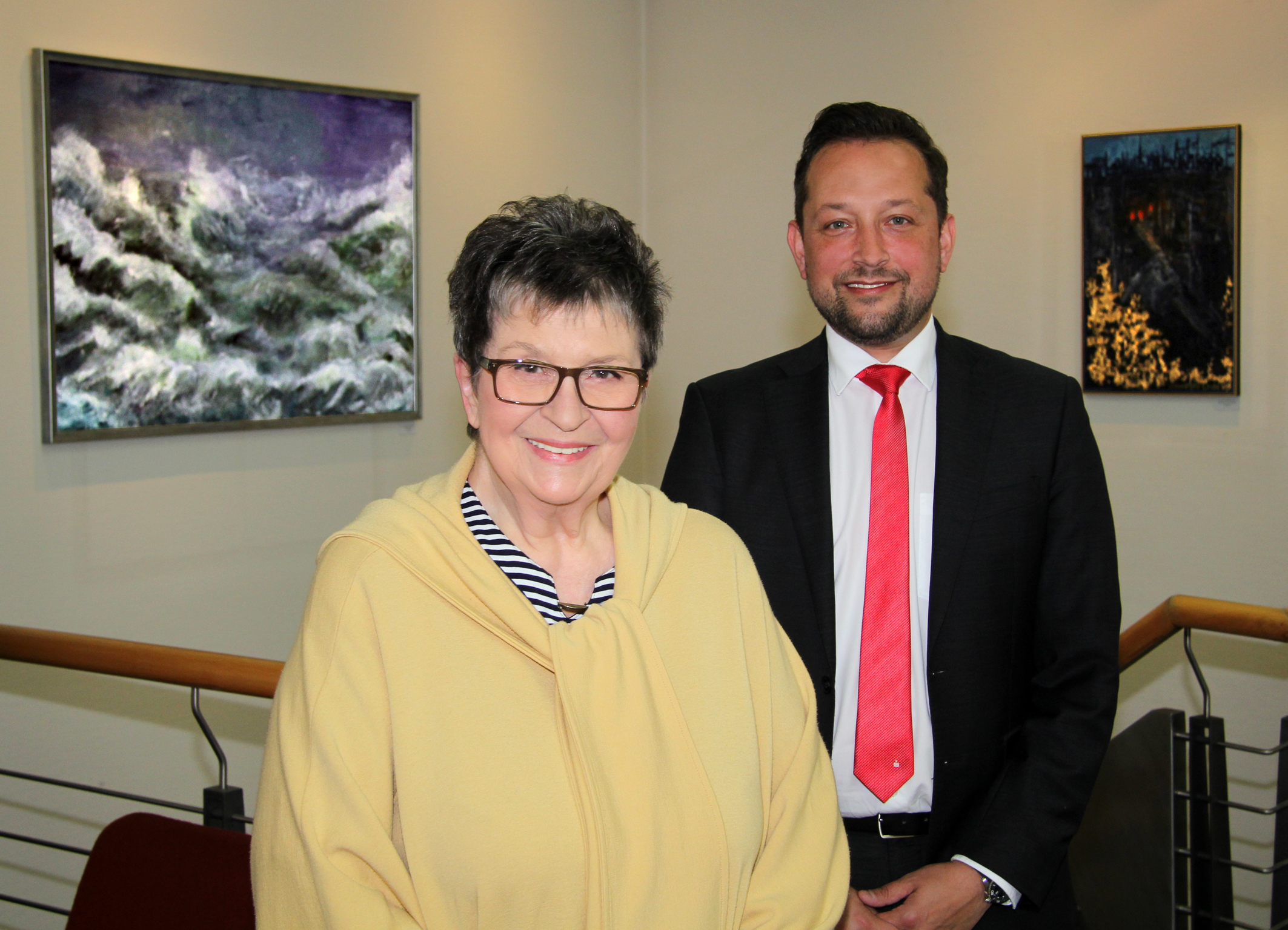 Die Gemälde „Poseidon“ und „Schwarzes Gold“ von Karin Gansekow haben einen festen Platz in der Asberger Sparkasse gefunden. Geschäftsstellenleiter Markus Schürmann und sein Team freuen sich darüber.