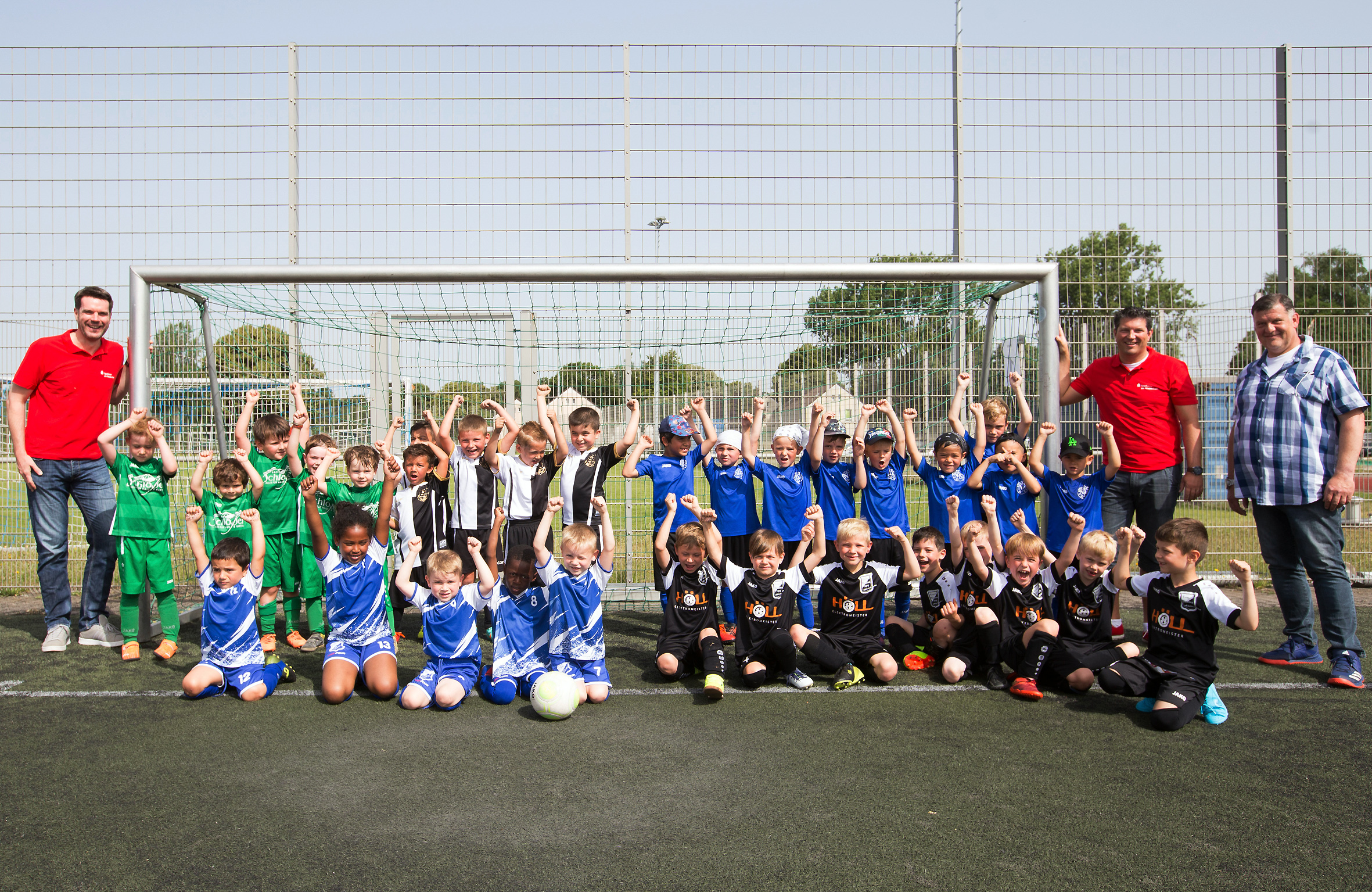 MOERS. Heiß schien die Sonne auf die Platzanlage des VfL Repelen. Aber fast noch heißer, nämlich auf Fußball, waren die jungen Kickerinnen und Kicker bei den Tagen des Jugendfußballs. Nachdem schon am Fronleichnamstag 800 Zuschauer die Spiele der E- und D-Junioren verfolgten, säumten auch am Samstag beim Turnier der Bambinis und der F-Jugend wieder 800 Besucher die Kleinspielfelder. Insgesamt 115 Teams traten an beiden Turniertagen an. Mit fünf Bambini-Mannschaften ließ sich Vereinsvorsitzender Jens Liebetanz (r.) sowie Marketingchef Stefan Ertelt und Geschäftsstellenleiter Oliver Heger vom Sponsor Sparkasse am Niederrhein ablichten. Vorne links jubeln die Kicker des DJK Kamp-Lintfort (blau-weiß) und rechts daneben die vom TV Kapellen (schwarz-weiß). Dahinter von links: SV Schwafheim (grün), SV Haesen-Hochheide (schwarz-weiß) und VfL Repelen (blau).