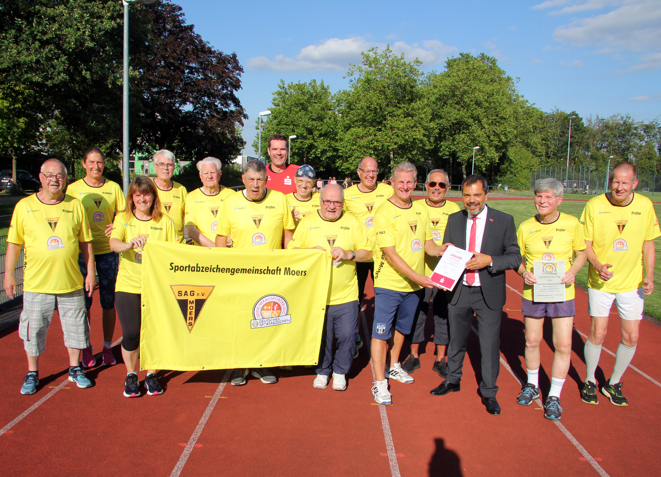 MOERS. Mit ihren zwölf ehrenamtlichen Prüfern hat die Sportabzeichengemeinschaft (SAG) Moers im vergangenen Jahr insgesamt 142 Sportabzeichen verliehen. Beim bundesweiten Sportabzeichen-Wettbewerb der Sparkassen-Finanzgruppe gewann die SAG damit jetzt zwei Geldpreise im Gesamtwert von 1500 Euro. Giovanni Malaponti, der Vorstandsvorsitzende der Sparkasse am Niederrhein, überreichte die Urkunde auf dem Sportgelände des Julius-Stursberg-Gymnasiums in Neukirchen.