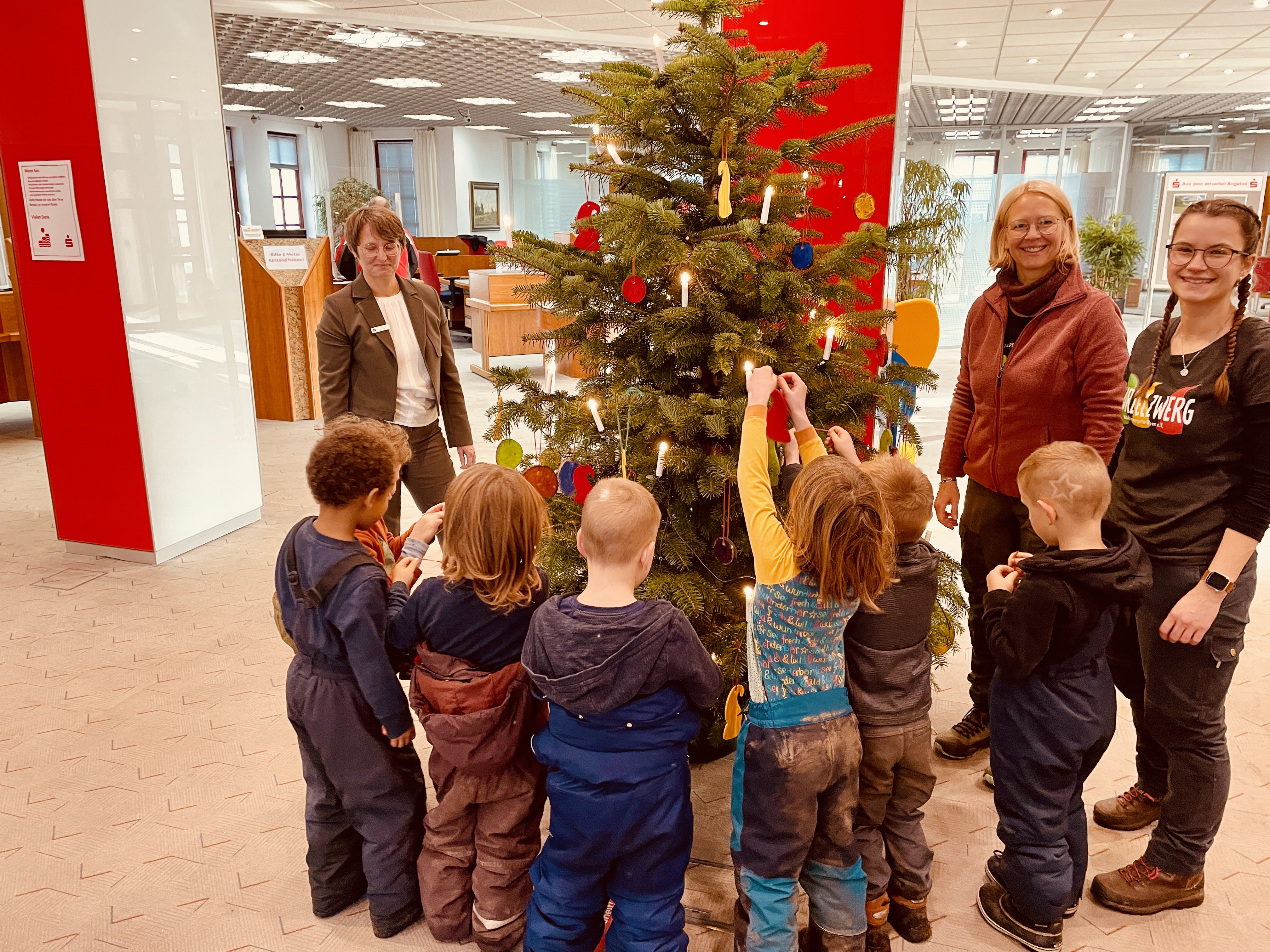 ALPEN. Sieben Füchse des Waldkindergartens schmückten jetzt den Weihnachtsbaum der Sparkasse an der Burgstraße. „Füchse sind die Kinder, die im nächsten Jahr in die Schule kommen“, so Erzieherin Christina Jochem. Gemeinsam mit ihrer Kollegin Corinna Smit-Stevens und den Kindern hatte sie in den vergangenen Tagen Baumschmuck aus Filz und Holz gebastelt. Am besten gefielen allen die Holzscheiben mit den schillernden bunten Punkten. Passend zum Anlass kamen die Kinder mit ihren Matschhosen von draußen vom Walde und erhielten nach getaner Arbeit ein kleines Geschenk von Geschäftsstellenleiterin Katrin Hüsch.