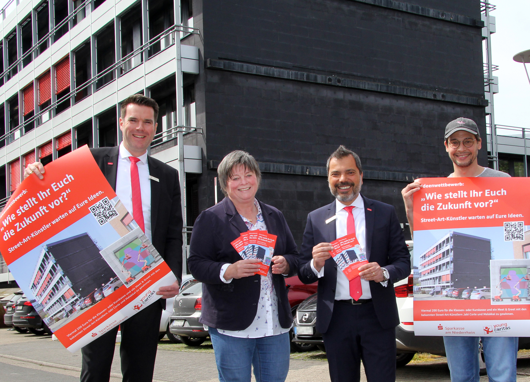 NIEDERRHEIN. Ab Mitte August wird die 16 mal 13 Meter große, schwarze Wand an der Sparkassen-Hauptstelle von den international bekannten Street-Art-Künstlern Jabi Corte und Malakkai nach den Vorstellungen von Jugendlichen neu gestaltet. Die Sparkasse am Niederrhein hat die Abgabefrist für ihren Ideen-Wettbewerb, an dem alle Klassen oder Kurse von weiterführenden Schulen teilnehmen können, bis zum letzten Schultag verlängert. Schülerinnen und Schüler können also noch bis Mittwoch, 21. Juni, ihre Antworten auf die Frage „Wie stellt Ihr Euch die Zukunft vor?“ über die Aktionsseite www.sk-an.de/ideenwettbewerb hochladen. Zu gewinnen gibt es viermal 200 Euro und ein Meet & Greet mit den Künstlern.