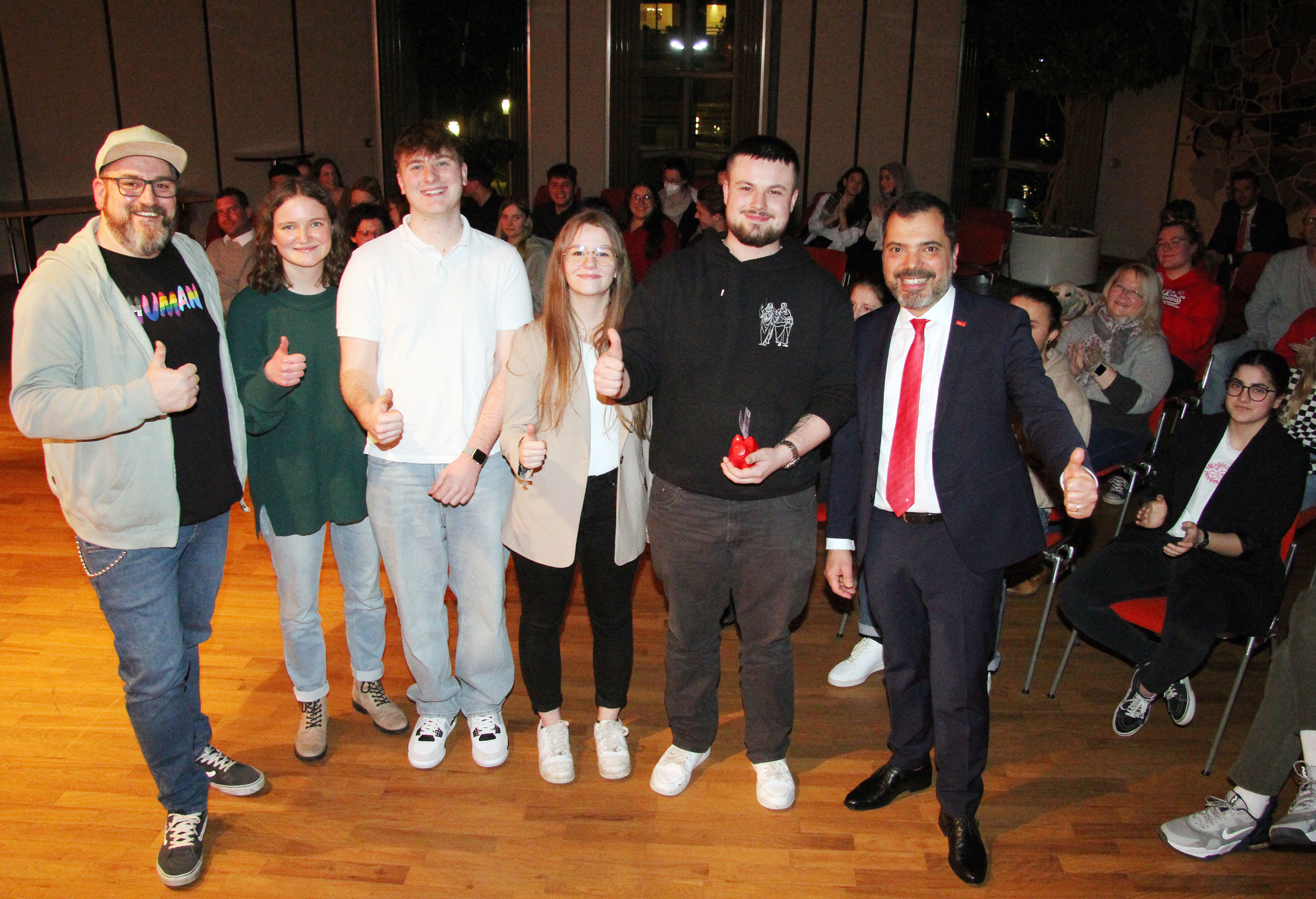 Feierliche Siegerehrung bei der neunten Staffel des Videowettbewerbs der Sparkasse am Niederrhein für Abschlussjahrgänge von weiterführenden Schulen. Über den ersten Platz freute sich das Filmteam der Willi-Fährmann-Gesamtschule. Laudator Markus Grimm (l.) lobte den berührenden und zugleich technisch perfekten Beitrag. Giovanni Malaponti (r.) gratulierte herzlich und überreichte 1.000 Euro Knete für die Fete.