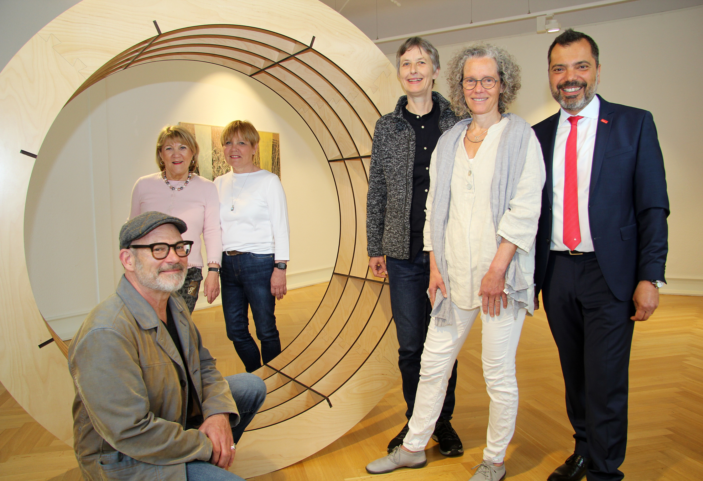 Kurator André Schweers (v.l.n.r.), die Töchter von Horst Inderbieten – Ellen und Loni – sowie Brigitta Heidtmann, Claudia Maas und Sparkassenchef Giovanni Malaponti in der neuen Ausstellung im Moerser Peschkenhaus.
