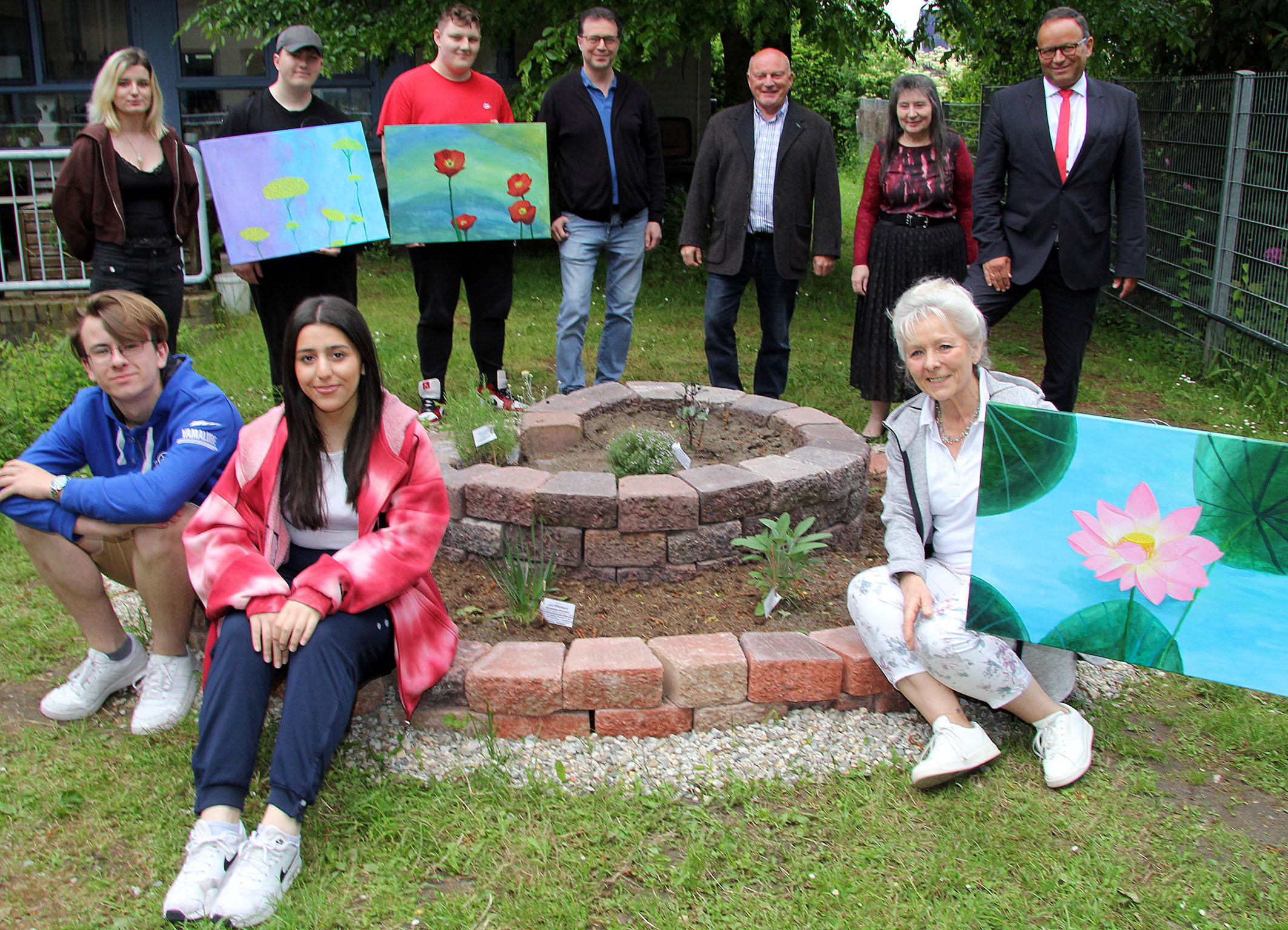 Schülerinnen und Schüler der Klasse 10 gestalteten mit der Kunstlehrerin Edith Beck-Kowolik, 3. v. r., die neue Kräuterspirale, deren Kosten die Sparkasse zum Jubiäum übernahm. Vorne rechts Dina Schwinges-Leo, dahinter nach links: Sparkassenvorstand Frank Rainer Laake, Johannes Munkes und Erhan Aydogan vom Team der Schulleitung.
