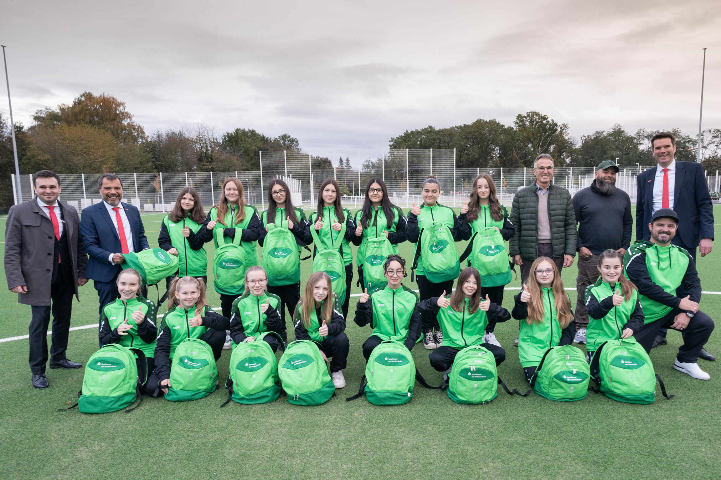 Präsentiert wurden die Rucksäcke von den 13- bis 14-jährigen Mädchen der neuen C-Jugendmannschaft. Helmut Sandrock: „Wir haben unseren Jugendfußballbetrieb in Rekordzeit neu aufgebaut und wollen weiter wachsen.“ Giovanni Malaponti, der selbst einmal für den MSV spielte, blickt über das riesige Sportareal dorthin, wo früher das alte Stadion stand und sagt: „Was der MSV hier für den Stadtteil Meerbeck auf den Weg gebracht hat, ist beeindruckend.“