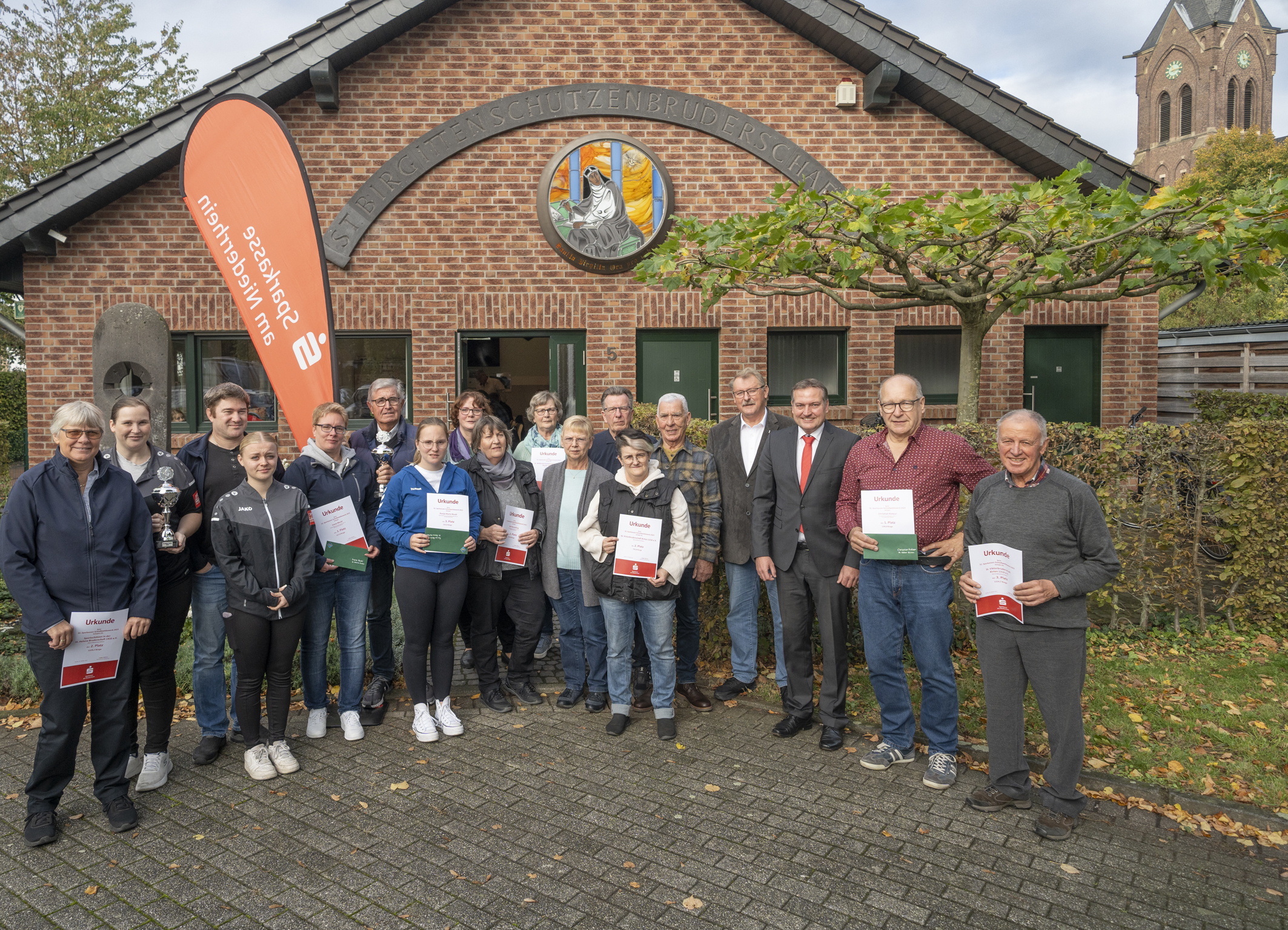 Gruppenfoto mit den Siegern der Mannschafts- und Einzelwertungen beim Sparkassen-Schießwettbewerb in Xanten. Ludger Wehren, 3. v. r., überreichte die Preisgelder.