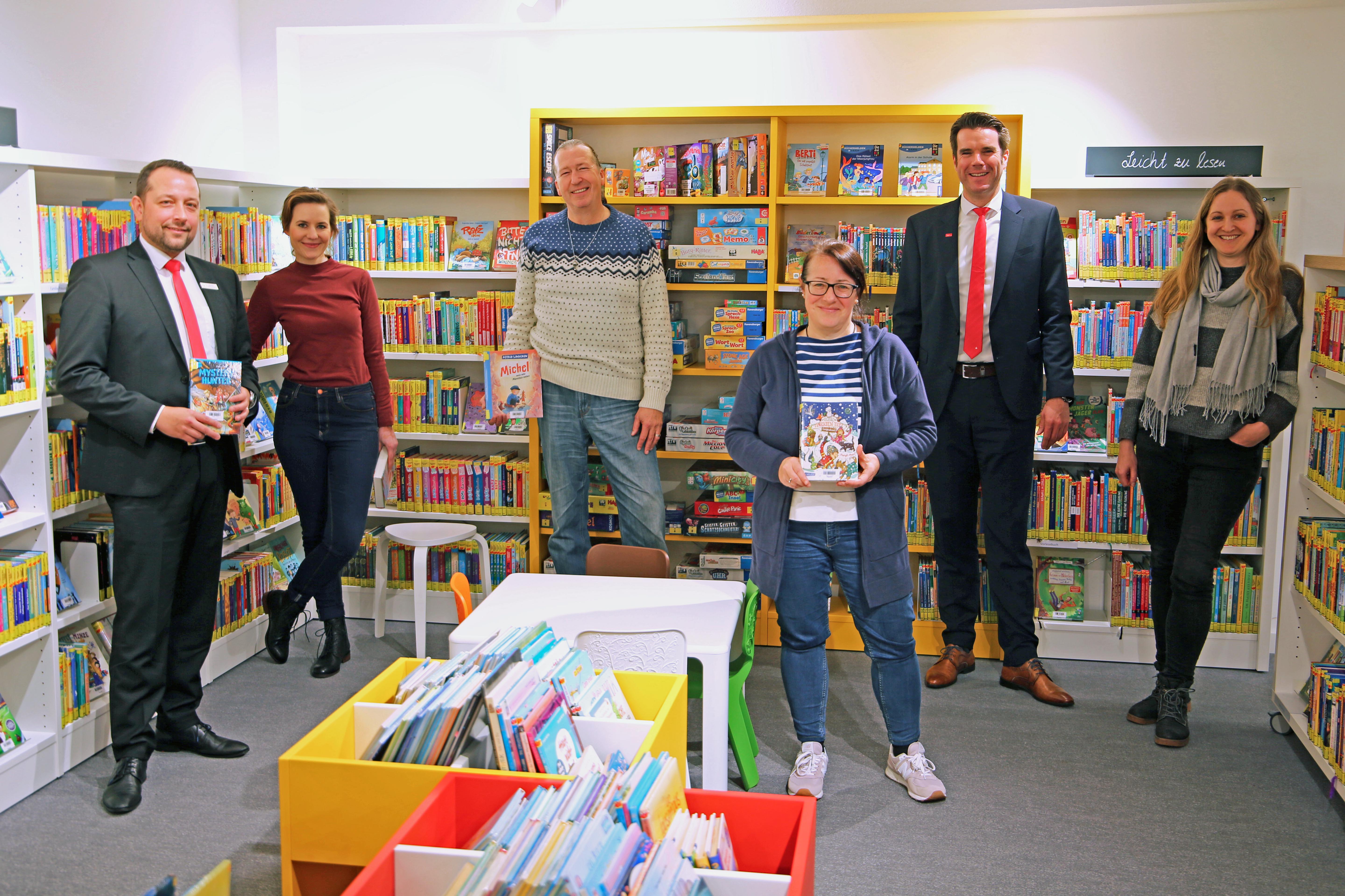 V.l.n.r: Markus Schürmann (Sparkasse Repelen), Lina Brünig, Volker Kuinke, Alexandra Wirth, Stefan Ertelt und Annika Giese (v. l.) freuen sich über die aktive Leseförderung im Stadtteil Repelen. (Foto: pst)
