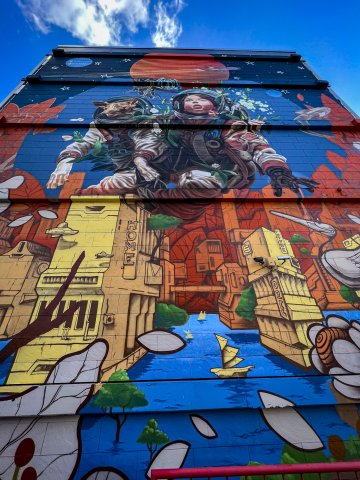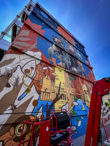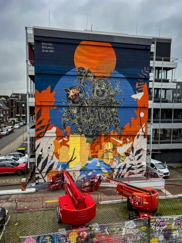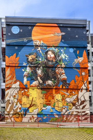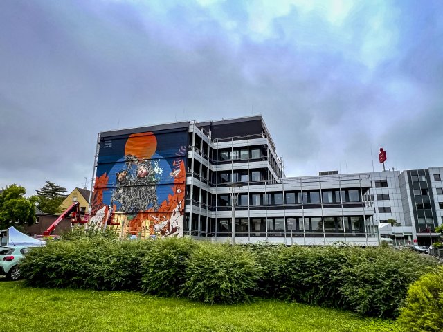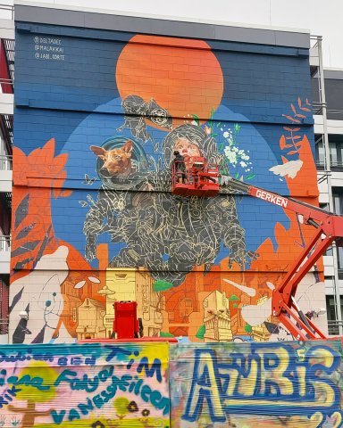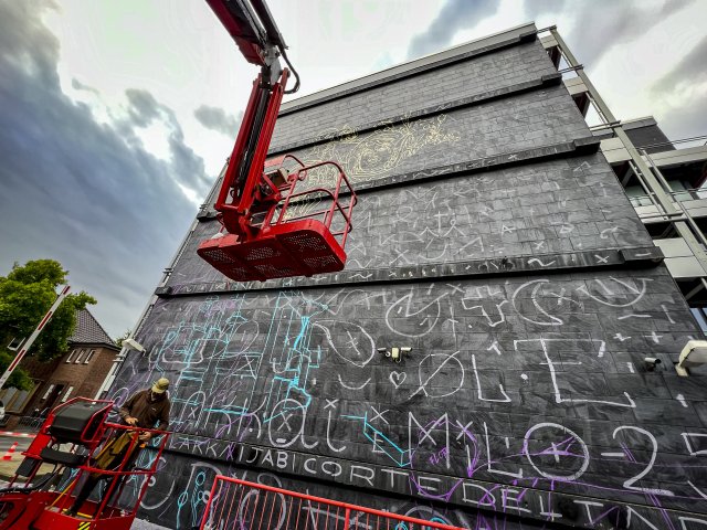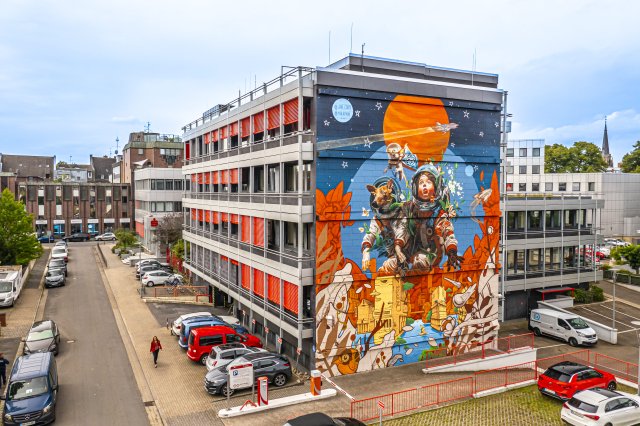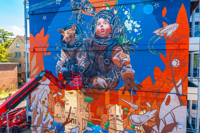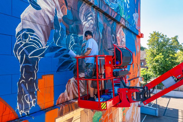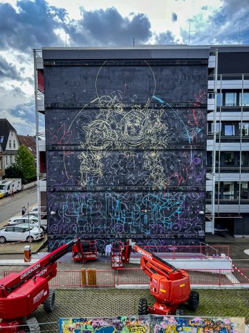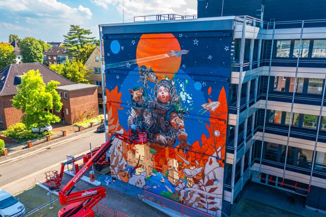 MOERS. Innerhalb von nur acht Tagen gestalteten international bekannte Street-Art-Künstler eine 16 Meter hohe und 13 Meter breite Wand der Sparkasse. Die Ideen dazu erhielten die beiden Spanier Jabi Corte und Malakkai von vier Schulklassen aus Moers und Neukirchen-Vluyn. Insgesamt hatten sich 15 Klassen von acht weiterführenden Schulen an dem Wettbewerb der Sparkasse am Niederrhein beteiligt. Alle hatten kurze Texte eingereicht, in denen sie die Frage „Wie stellt Ihr Euch die Zukunft vor“ beantworteten. Gemeinsam mit Auszubildenden der Sparkasse und des Caritasverbandes Moers-Xanten wählten die beiden Künstler die Gewinnertexte aus und legten los.