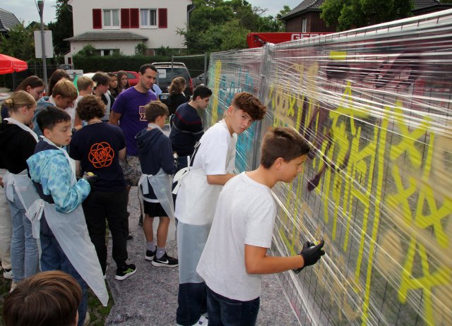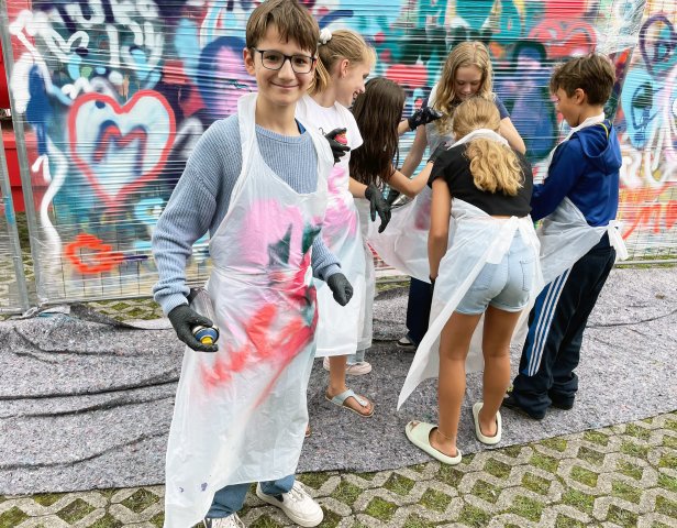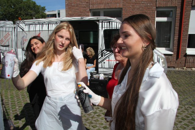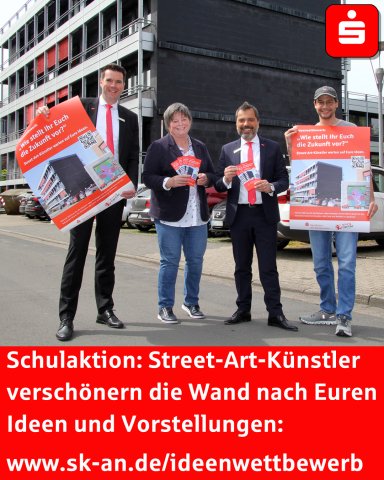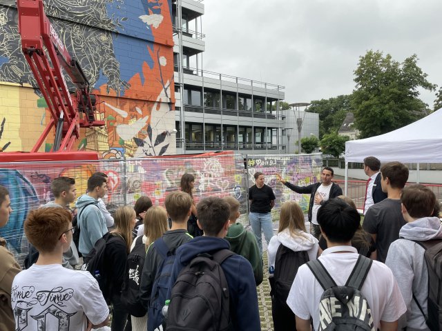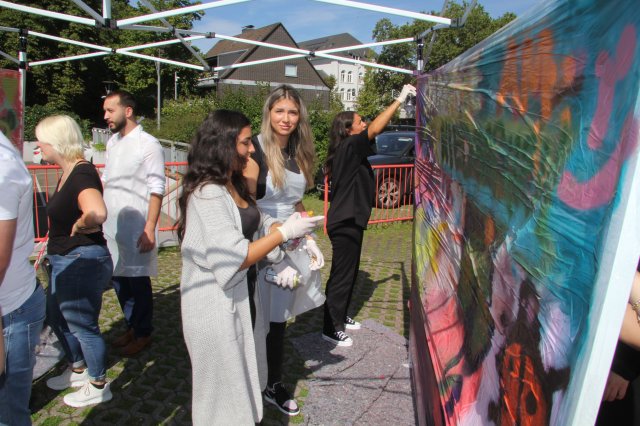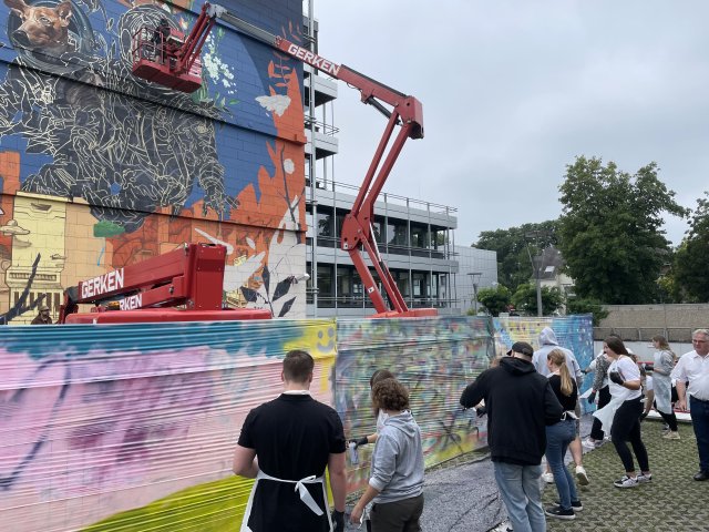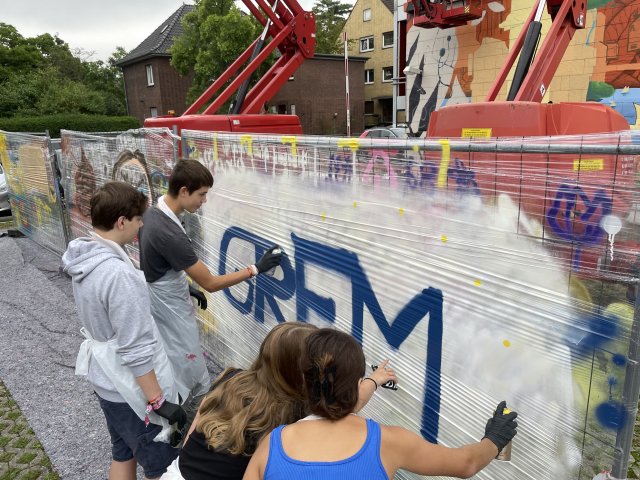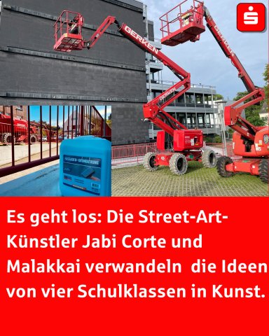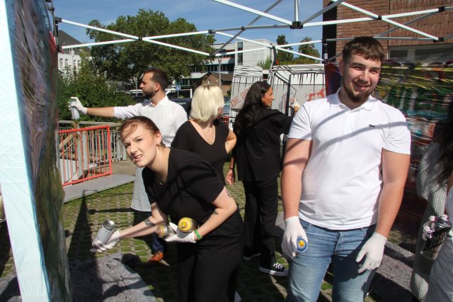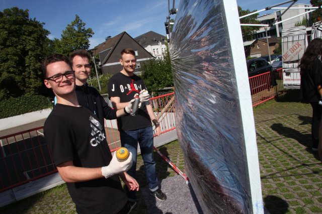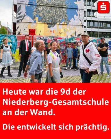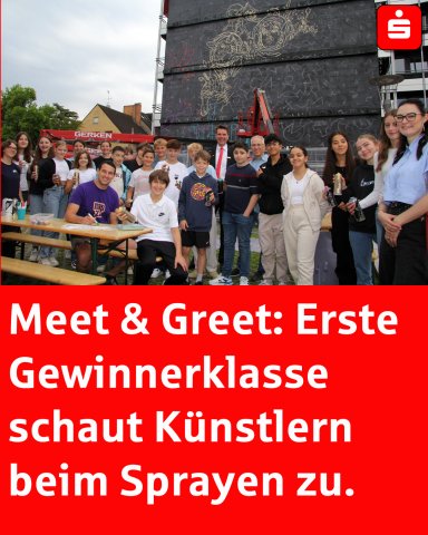 Die Schülerinnen und Schüler der 6b des Julius-Stursberg-Gymnasiums, der 9d der Gesamtschule Niederberg sowie der 10b des Gymnasiums Rheinkamp und der 8d des Gymnasiums Adolfinum erkannten ihre Ideen auf dem Wandbild sofort wieder. Die Sparkasse hatte mit Unterstützung durch das Caritas-Team alle vier Gewinnerklassen eingeladen, bei der Entstehung des Bildes dabei zu sein. Während die Künstler auf den Hubwagen arbeiteten, gestalteten die Jugendlichen mit Spraydosen eigene Kunstwerke. Zudem erhielten sie für ihre Klassenkassen jeweils 200 Euro.