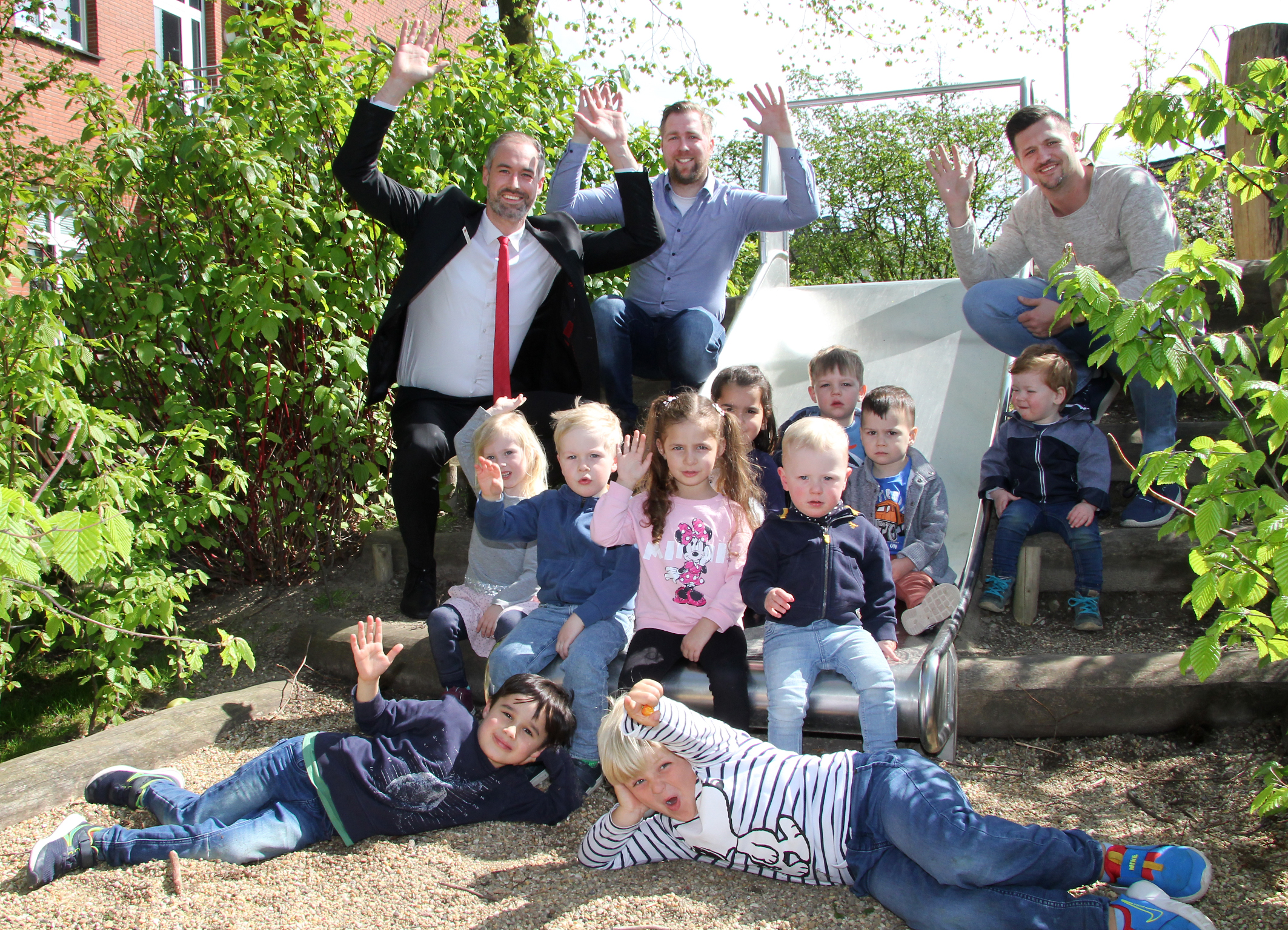 MOERS. Überall treibt das frische Grün aus. Auch der neu gestaltete Außenbereich der Kita an der Asberger Straße präsentiert sich im bunten Kleid. Marcel Scheibmayer, der Vorsitzende des Rasselbande e.V., sagt: „Jetzt wird erst so richtig sichtbar, was einfallsreiche Planung, gute Handwerksarbeit und das Engagement der Eltern bewirkt haben.“ Nino Janoschek formuliert es so: „Ein tolles Spiel- und Erlebnisparadies.“ Der stellvertretende Geschäftsstellenleiter der Asberger Sparkasse ist zu Besuch, um sich insbesondere die neue Rutsche anzusehen. „Die konnten wir uns vom Spendengeld der Sparkasse am Niederrein kaufen“, sagt Marcel Scheibmayer. Dass das Spielgerät bei den 37 Kindern gut ankommt, bestätigt Kita-Leiter Marcel Forster: „Die Rutsche ist super stabil und extra breit, da können gleich mehrere Kids zusammen nach unten zu sausen.“